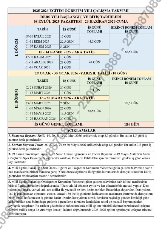 2025-2026 Eğitim Öğretim Yılı Çalışma Takvimi